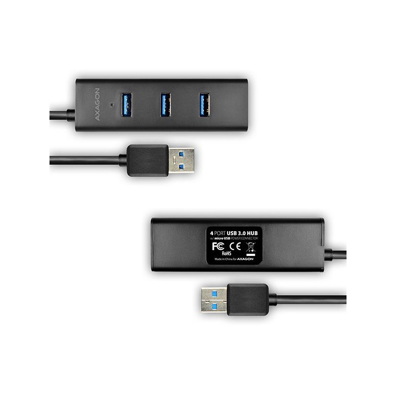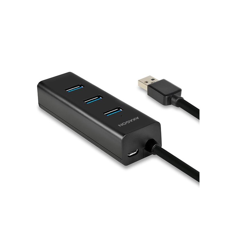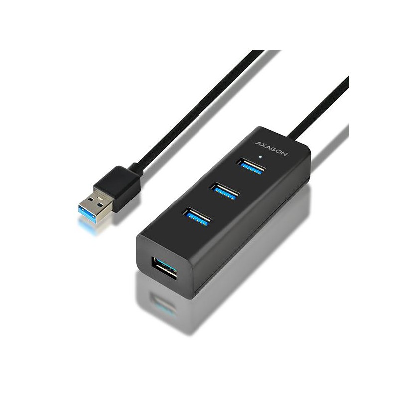 The four port AXAGON HUE-S2BL USB 3.0 hub with a 1.2 m long USB cable, optional external power and fast charging support on all ports.