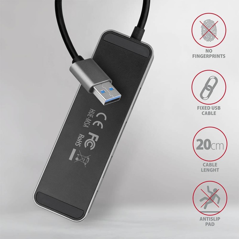 The metal hub body is made of aluminum and provides perfect mechanical protection for frequent carrying. Elegant finely structured body surface against fingerprint. Rubber pads prevent slipping up on the table. Permanently fixed 20 cm long USB cable is ideal for users of mobile devices.