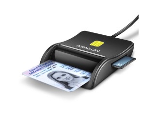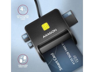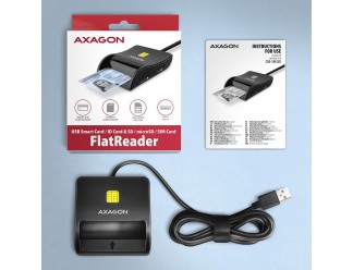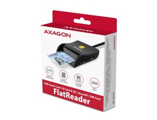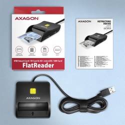 Compact desktop smart card / ID card reader AXAGON CRE-SM3SD FlatReader with USB 2.0 interface includes additional slots for SD, microSD and SIM cards. The card reader supports all common contact smart card formats, chip cards and other cards, including contact bank payment cards or contact electronic ID cards *. The reader is compatible with most national applications for eID (electronic ID cards).