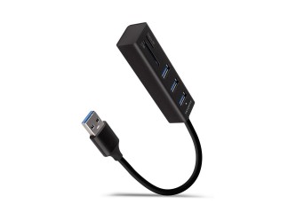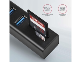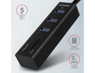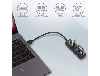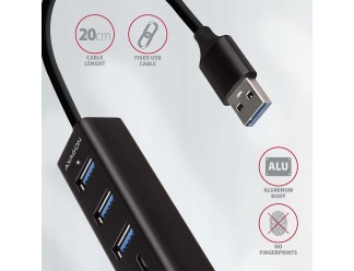 Metal USB 3.2 Gen 1 (USB 3.0) multi-port hub AXAGON HMA-CR3A connects up to three USB devices to laptop or computer and also adds SD / microSD card reader.