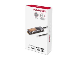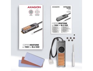 AXAGON CLR-M2FAN copper heatsink with fan for perfect cooling of high performance M.2 SSD disks, especially NVMe. The universal heatsink can be used for M.2 cards with size 22 x 80 mm. Supplied thermally conductive pads allow heatsink installation for all single-sided as well as double-sided M.2 SSD disks.