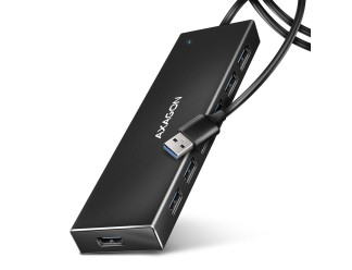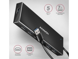 The slim USB 3.2 Gen 1 (USB 3.0) hub AXAGON HUE-F7A with a 1 m long USB cable easily and quickly connects up to seven USB devices to the computer at the same time. The USB 3.2 Gen 1 standard enables transfer speeds of up to 5Gb/s.