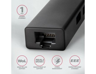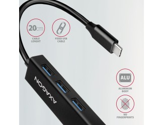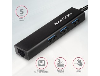 Slim metal USB-C 3.2 Gen 1 (USB 3.0) multi-port hub AXAGON HMC-GL3A connects up to three USB devices to laptop or computer and also adds Gigabit network card which connects your computer to high speed network.
