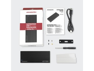 Superfast external AXAGON EEM2-GTR THIN RIB box with USB 3.2 Gen 2 interface is designed for NVMe (PCI-Express) M.2 SSD disks. The double-sided USB-C connector on the box together with the supplied USB-C -> USB-C cable enables a reliable connection to a computer.