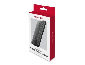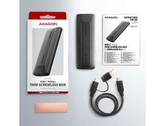 Universal external AXAGON EEM2-GTS2 THIN SCREWLESS box with USB 10Gbps interface for M.2 NVMe or SATA SSD disks. The double-sided USB-C connector on the box enables a reliable connection. The package includes not only a USB-C -> USB-C cable for connecting the box to a computer, but also a USB-C -> USB-A adapter. You can connect the box to any free USB port on the notebook.