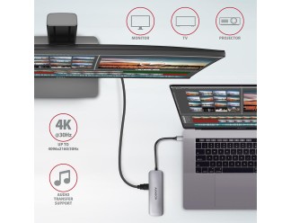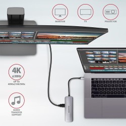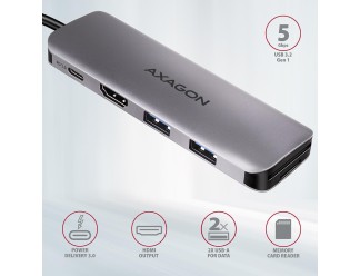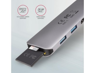 Multiport USB-C 3.2 Gen 1 hub AXAGON HMC-5 expands your laptop, computer or phone with four ports and SD / microSD card reader. You can easily and quickly connect up to two USB devices, card reader and HDMI display to your computer at the same time via the double-sided USB-C connector. You also get the possibility to supply laptop using Power Delivery technology at the same time. The USB-C hub will provide you with a simple and compact 5in1 docking station for notebook like MacBook Pro.