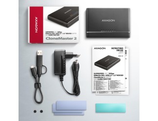 Included Accessories • M.2 + 2.5"/3.5" SSD/HDD adapter, • power adapter 100-240V / 12V-2A, • 4 thermal conductive pads, • USB-C <-> USB-C cable 30 cm long + USB-C -> USB-A reduction