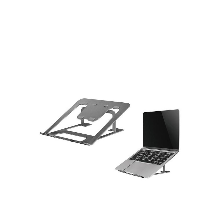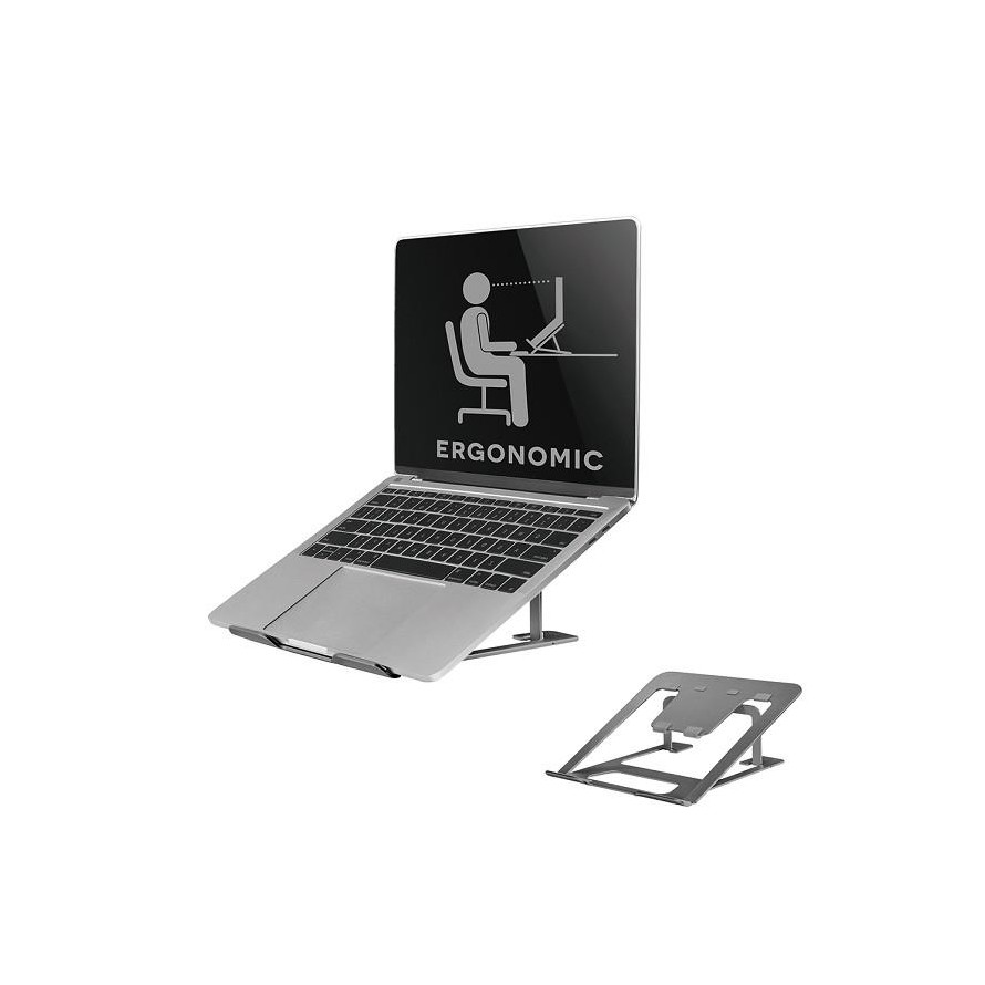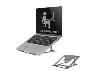 The Neomounts by Newstar NSLS085GREY is a universal stand for laptops from 10" up to 17", with a maximum weight capacity of 5 kg. The stand has six different height positions and a ultra-slim folding design. The lightweight, compact design makes the stand ideal to take with you wherever you want. The open configuration ensures good ventilation of the laptop and the anti-skid silicon pads and safety ledge stopper ensure solid positioning.