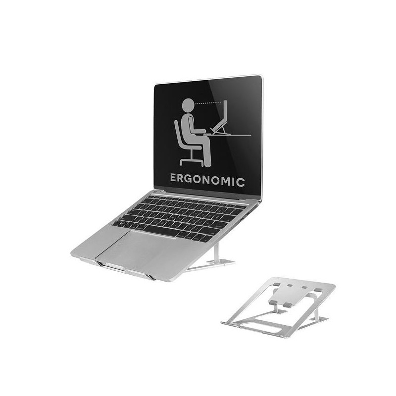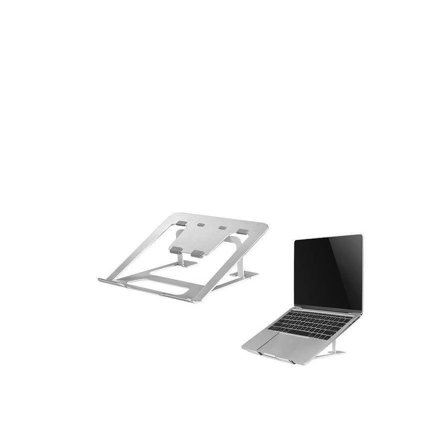 The Neomounts by Newstar NSLS085SILVER is a universal stand for laptops from 10" up to 17", with a maximum weight capacity of 5 kg. The stand has six different height positions and a ultra-slim folding design. The lightweight, compact design makes the stand ideal to take with you wherever you want. The open configuration ensures good ventilation of the laptop and the anti-skid silicon pads and safety ledge stopper ensure solid positioning.