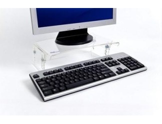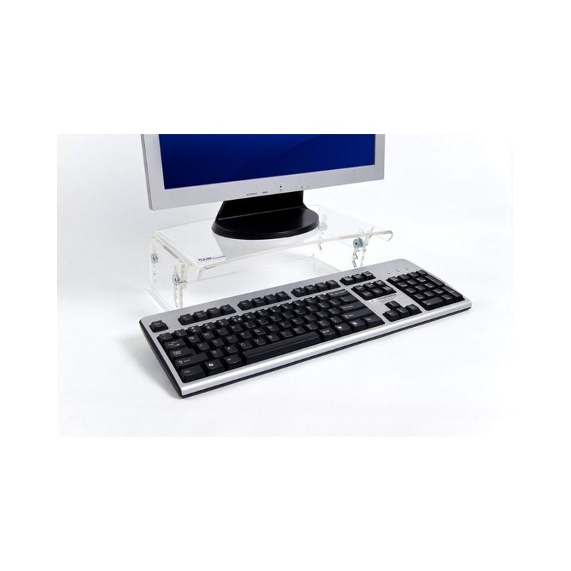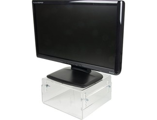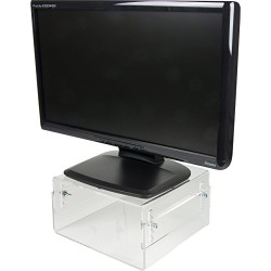 The NewStar acrylic monitor riser, model NSMONITOR40 is a height adjustable monitor riser for screens up to 25 kilo. It fits CRT and flat screens. Stunning looks due to crystal clear acrylic material. The surface is polished for optimum appearance. The keyboard fits in the special slots to keep the workplace clean. Change the height of your screen in 4 steps from 7 to 13 cm. Width 32 cm, depth 26 cm and height from 7 to 13 cm in steps of 1.5 each. By using an ergonomic mount neck- and back complaints can be avoided. Ideal for use in offices and on counters or in a reception area. All installation material is included with the product.