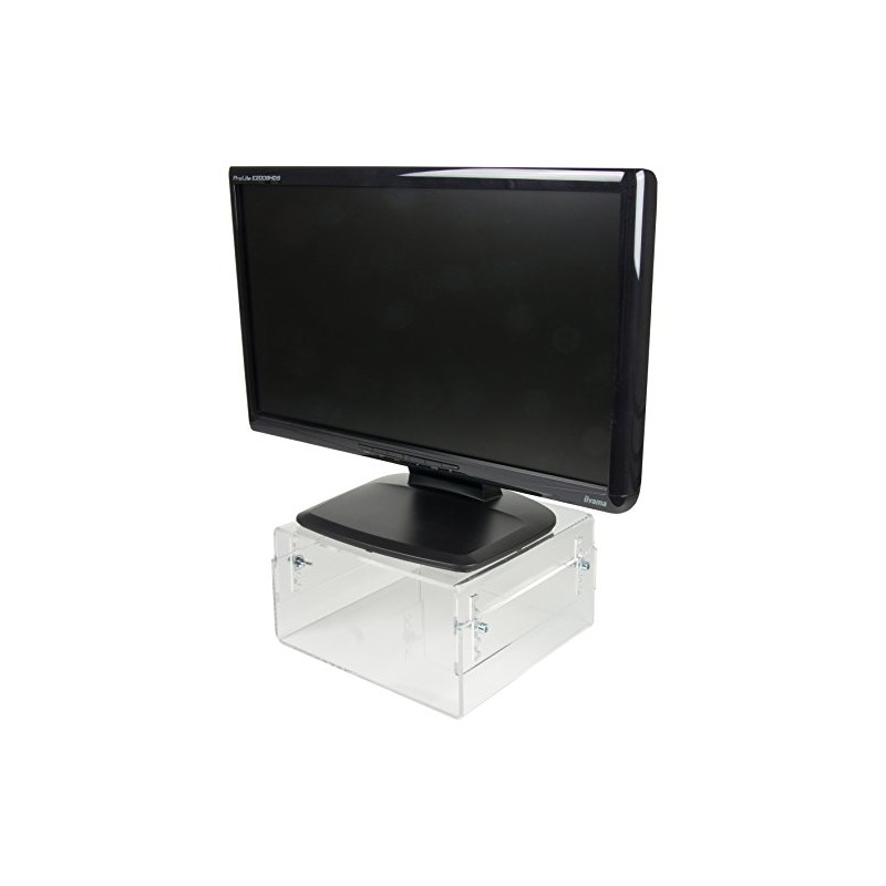 The NewStar acrylic monitor riser, model NSMONITOR40 is a height adjustable monitor riser for screens up to 25 kilo. It fits CRT and flat screens. Stunning looks due to crystal clear acrylic material. The surface is polished for optimum appearance. The keyboard fits in the special slots to keep the workplace clean. Change the height of your screen in 4 steps from 7 to 13 cm. Width 32 cm, depth 26 cm and height from 7 to 13 cm in steps of 1.5 each. By using an ergonomic mount neck- and back complaints can be avoided. Ideal for use in offices and on counters or in a reception area. All installation material is included with the product.