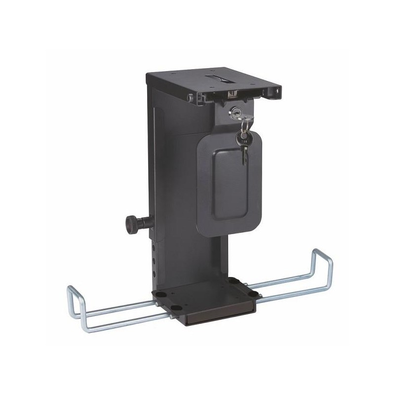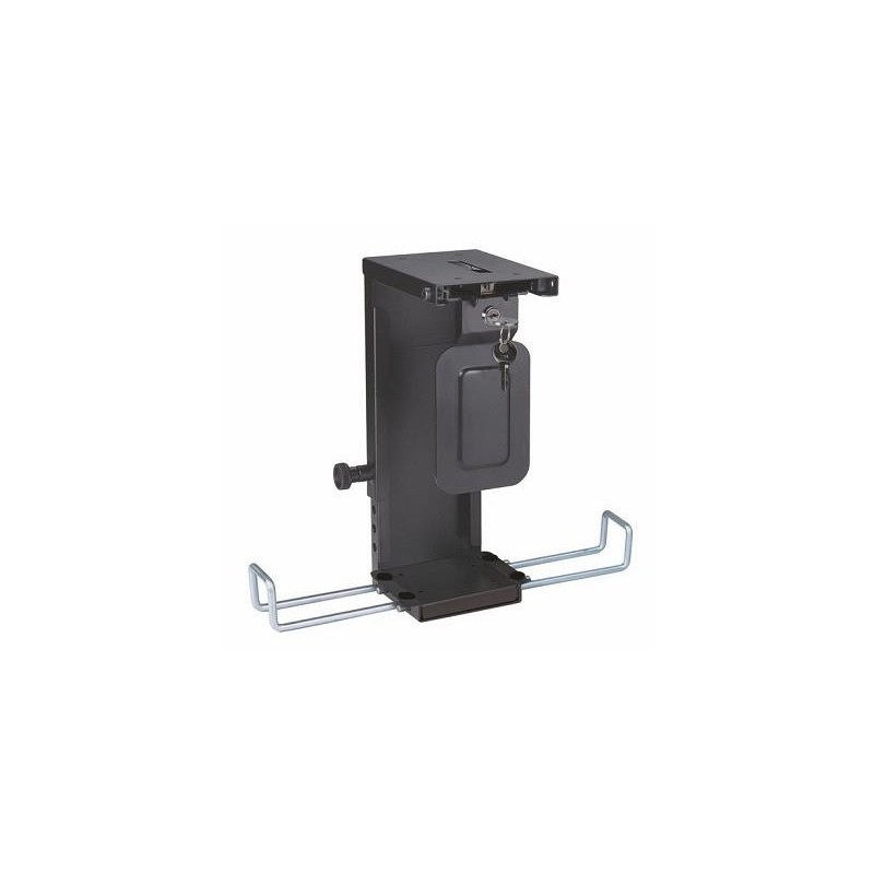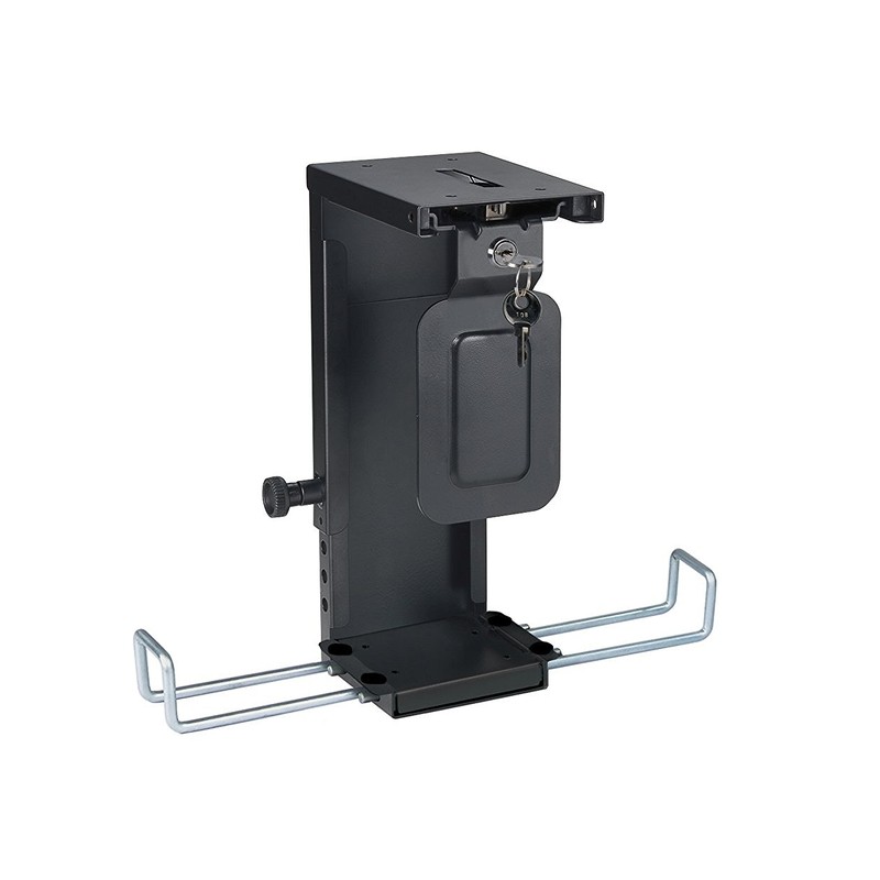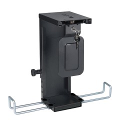 This Neomounts CPU mount, model CPU-D075BLACK/LK, allows you to mount a computer under a desk and to secure it using a locking system. A CPU mount creates a need and clean desk because its stored under the desk and doesn't use any valuable desk space. Increase the lifetime of your CPU due to reduction intake dust and dirt from floors. Keep the workplace clean without computers on the floor. This Neomounts CPU mount allows vertical installation of computers. Hide your cables and keep the workplace nice and tidy. Easy to adjust in width and depth to fit most desktop and tower PCs. The specifications listed show maximum and minimum width and depth of the mount. All installation material is included with the product.