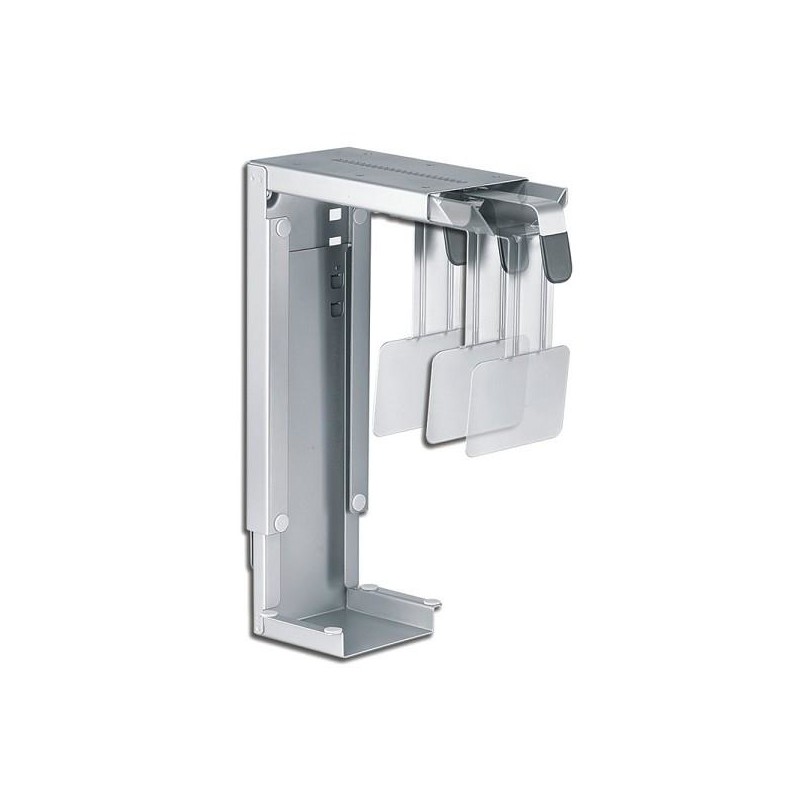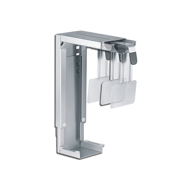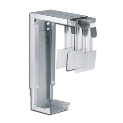 This Neomounts CPU mount, model CPU-D100SILVER, allows you to mount a computer under a desk. A CPU mount creates a need and clean desk because its stored under the desk and doesn't use any valuable desk space. Increase the lifetime of your CPU due to reduction intake dust and dirt from floors. Keep the workplace clean without computers on the floor. This Neomounts CPU mount allows vertical installation of computers. Hide your cables and keep the workplace nice and tidy. Easy to adjust in width and depth to fit most desktop and tower PCs. The specifications listed show maximum and minimum width and depth of the mount. All installation material is included with the product.