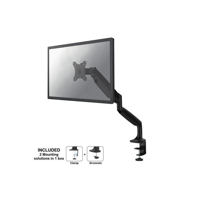 The Neomounts Select desk mount, model NM-D750BLACK is a tilt-, swivel and rotatable desk mount for flat screens up to 32". This mount is a great choice for space saving placement on desks using a desk clamp or grommet mount. Neomounts Selects? unique tilt (180°), rotate (180°) and swivel (360°) technology allows the mount to change to any viewing angle to fully benefit from the capabilities of the flat screen. The mount is easily height adjustable from 17 to 51 centimetres using a gas spring. Depth adjustable from 0 to 61 centimetres. A unique cable management conceals and routes cables from mount to flat screen. Hide your cables to keep the workplace nice and tidy. Neomounts Select NM-D750BLACK has three pivot points and is suitable for screens up to 32" (82 cm). The weight capacity of this product is 9 kg each screen. The desk mount is suitable for screens that meet VESA hole pattern 75x75 or 100x100mm. Different hole patterns can be covered using Neomounts Select VESA adapter plates. By using an ergonomic mount neck- and back complaints can be avoided. Ideal for use in offices and on counters or in a reception area. All installation material is included with the product.