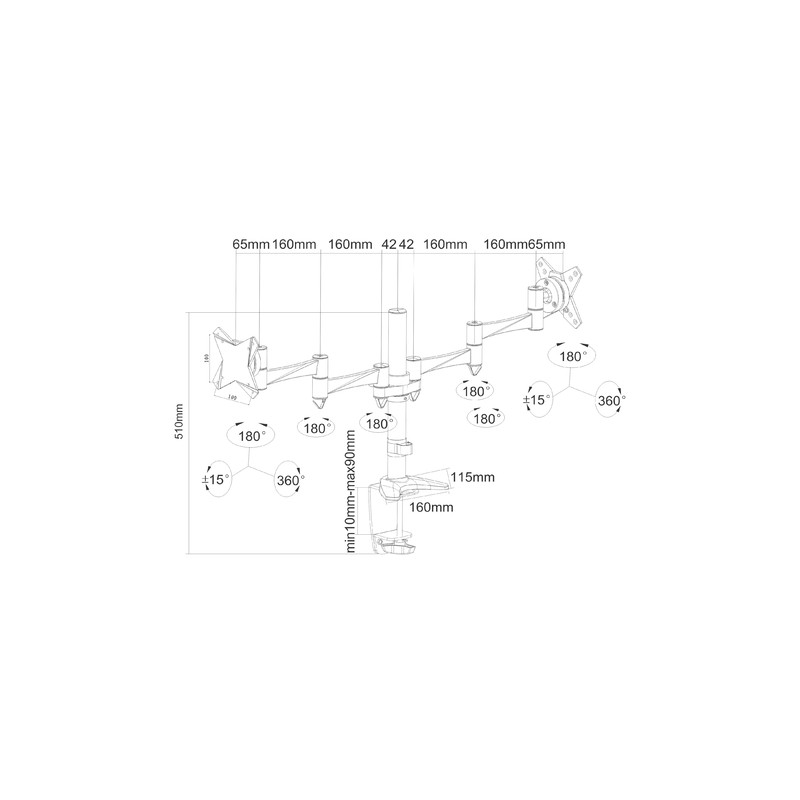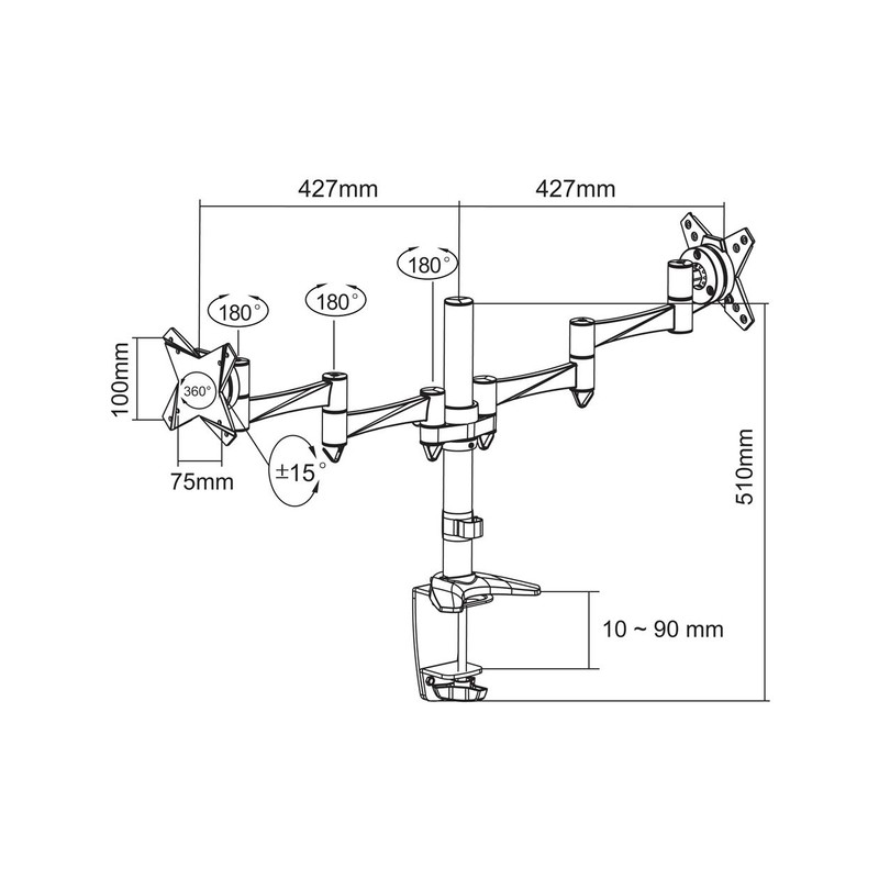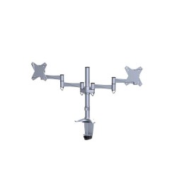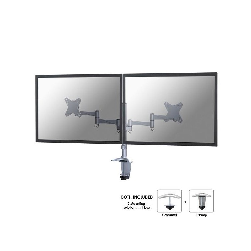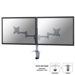 The Neomounts desk mount, model FPMA-D1330DSILVER is a tilt-, swivel and rotatable desk mount for 2 flat screens up to 27". This mount is a great choice for space saving placement on desks using a desk clamp or grommet mount. Neomounts versatile tilt (30°), rotate (360°) and swivel (180°) technology allows the mount to change to any viewing angle to fully benefit from the capabilities of the flat screen. The mount is manually height adjustable from 0 to 40 centimetres. Depth adjustable from 4 to 43 centimetres. An innovative cable management conceals and routes cables from mount to flat screen. Hide your cables to keep the workplace nice and tidy. Neomounts FPMA-D1330DSILVER has three pivot points and is suitable for screens up to 27" (69 cm). The weight capacity of this product is 8 kg each screen. The desk mount is suitable for screens that meet VESA hole pattern 75x75 or 100x100mm. Different hole patterns can be covered using Neomounts VESA adapter plates. By using an ergonomic mount neck- and back complaints can be avoided. Ideal for use in offices and on counters or in a reception area. All installation material is included with the product.