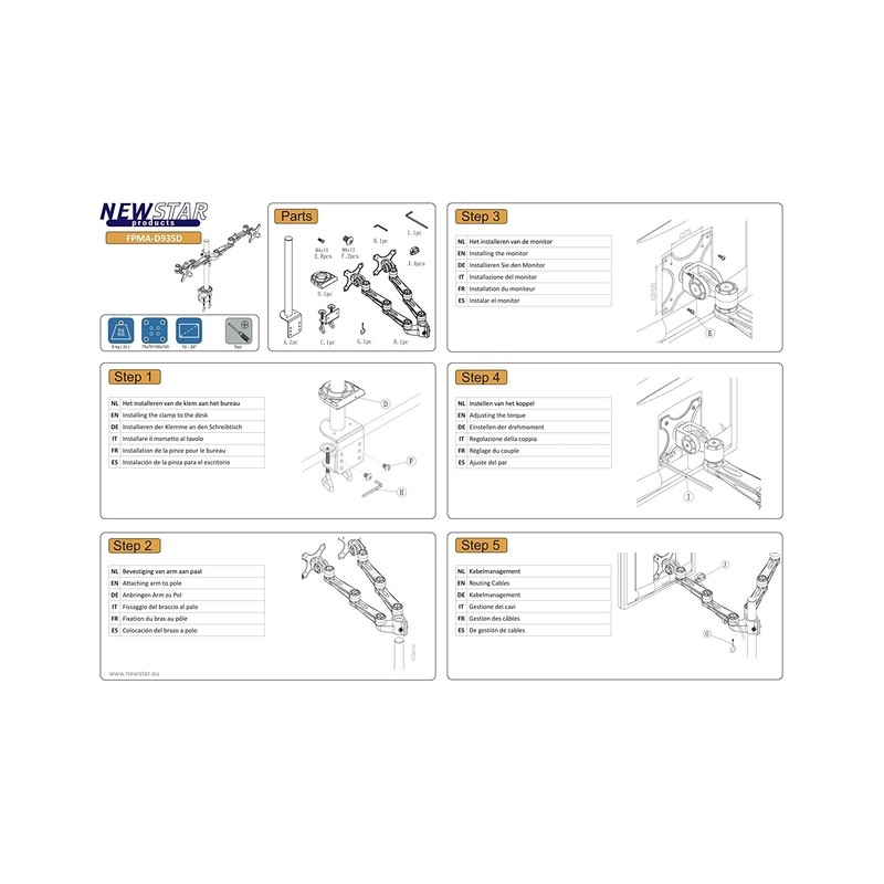 NewStar FPMA-D935D has three pivot points and is suitable for screens up to 26" (65 cm). The weight capacity of this product is 6 kg each screen. The desk mount is suitable for screens that meet VESA hole pattern 75x75 or 100x100mm. Different hole patterns can be covered using NewStar VESA adapter plates.
