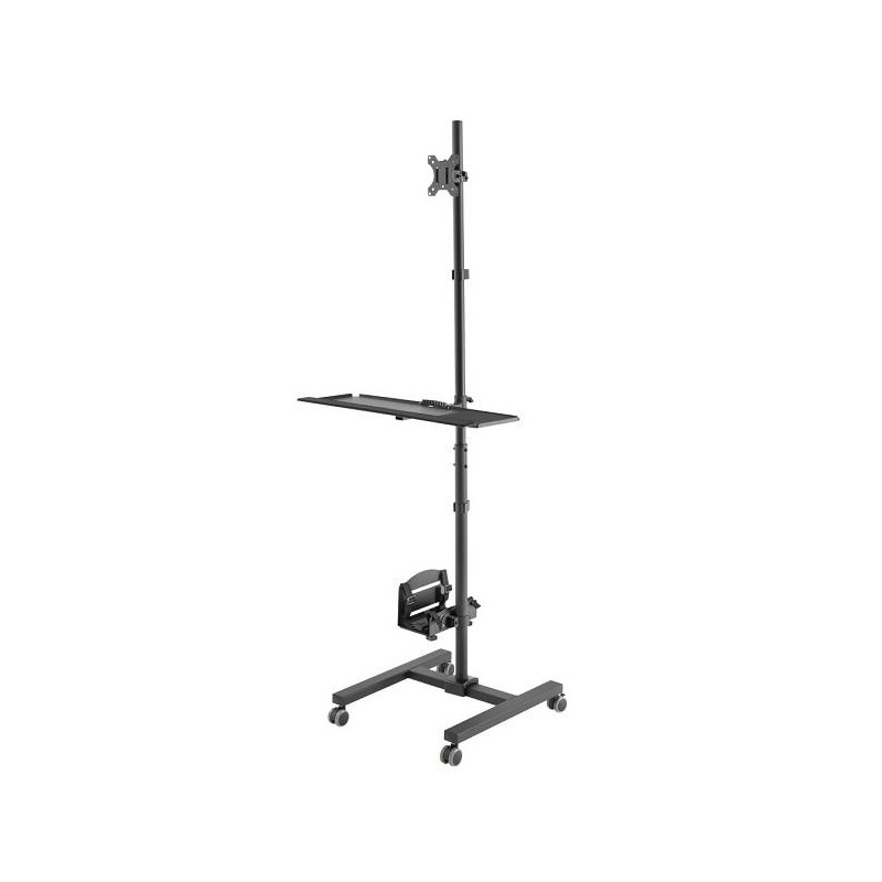 The Neomounts floor stand, model FPMA-MOBILE1700 is a mobile floor stand for flat screens up to 32" for keyboards, mice and PC. This mobile stand is a great choice for space saving placement or when wall-, ceiling mounting or desk placement is not an option. This cart stretches your investment by serving a variety of projection needs by sharing a display, keyboard, mouse and PC over multiple rooms. Get optimal positioning for both standing and seated audiences, in any application, in any part of your location. Neomounts versatile tilt (30°), turn (360°) and swivel (360°) technology allows the mount to change to any viewing angle to fully benefit from the capabilities of the flat screen. The mount is manually height adjustable from 94 to 175 centimetres. An innovative cable management conceals and routes cables from mount to flat screen. Hide your cables to keep the stand nice and tidy. Neomounts' floor stand, FPMA-MOBILE1700 holds your screen and even hides your cables. The casters allow the stand to move it to where you need it. Easily roll this cart through doorways and over thresholds. Neomounts FPMA-MOBILE1700 has one pivot point and is suitable for screens up to 32" (81 cm). The weight capacity of this product is 3-8 kg for the flat screen, 10 kg for the PC and 2 kg for keyboard and mouse. The stand is suitable for screens that meet VESA hole pattern 75x75 & 100x100mm. Different hole patterns can be covered using Neomounts VESA adapter plates. Speedy assembly and installation. All installation material is included with the product.