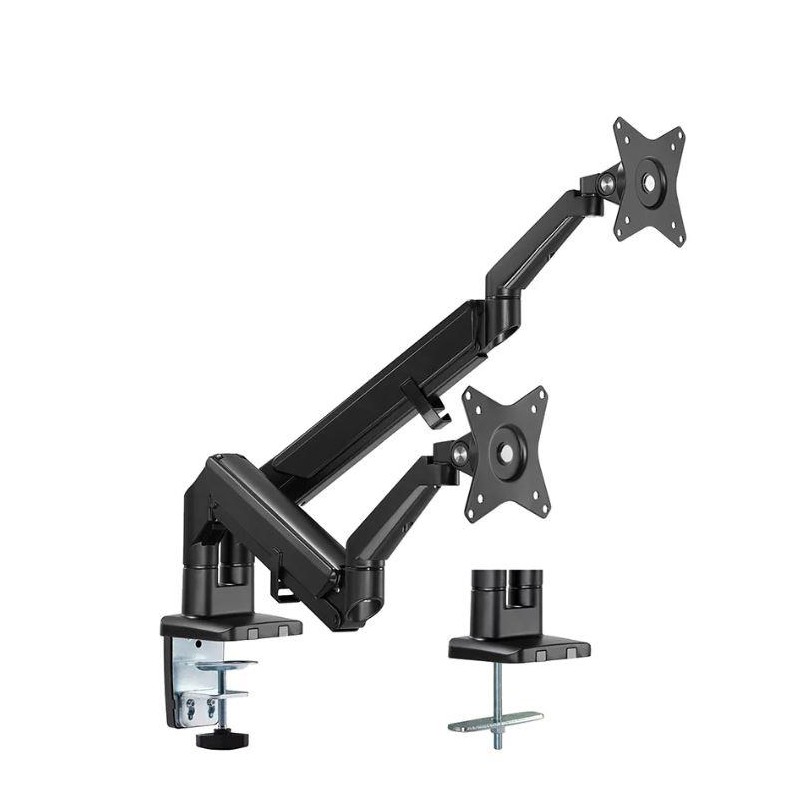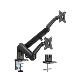 The Neomounts DS70-810BL2 is a full motion desk mount for two flat screens up to 32" with a maximum weight capacity of 9 kg per screen. The versatile tilt (90°), rotate (360°) and swivel (180°) technology allows the mount to change to any viewing angle to fully benefit from the capabilities of your screens. Additionally, the mount features gas spring height adjustment (26,5-55 cm) and depth adjustment (0-49 cm), to create the perfect working position. Additionally, the DS70-810BL2 features the nifty 180° stop mechanism, that allows you to safely adjust the mount even when it's placed close to a wall or separation panel without making contact. The smart cable management clips ensure orderly routing of the cables. Due to the short T-Rex® upper arm, only minimal depth is required when placed near a wall or separation panel.This allows the screens to be positioned further away from the user which is better for the eyes and also leaves more space for good ergonomic working posture. The DS70-810BL2 is suitable for screens that meet VESA hole pattern 75x75 or 100x100mm. Unused hole patterns can be covered using one of Neomounts VESA adapter plates. The DS70-810BL2 is equipped with an Quick-release VESA system for easy installation and comes with both desk clamp and grommet.