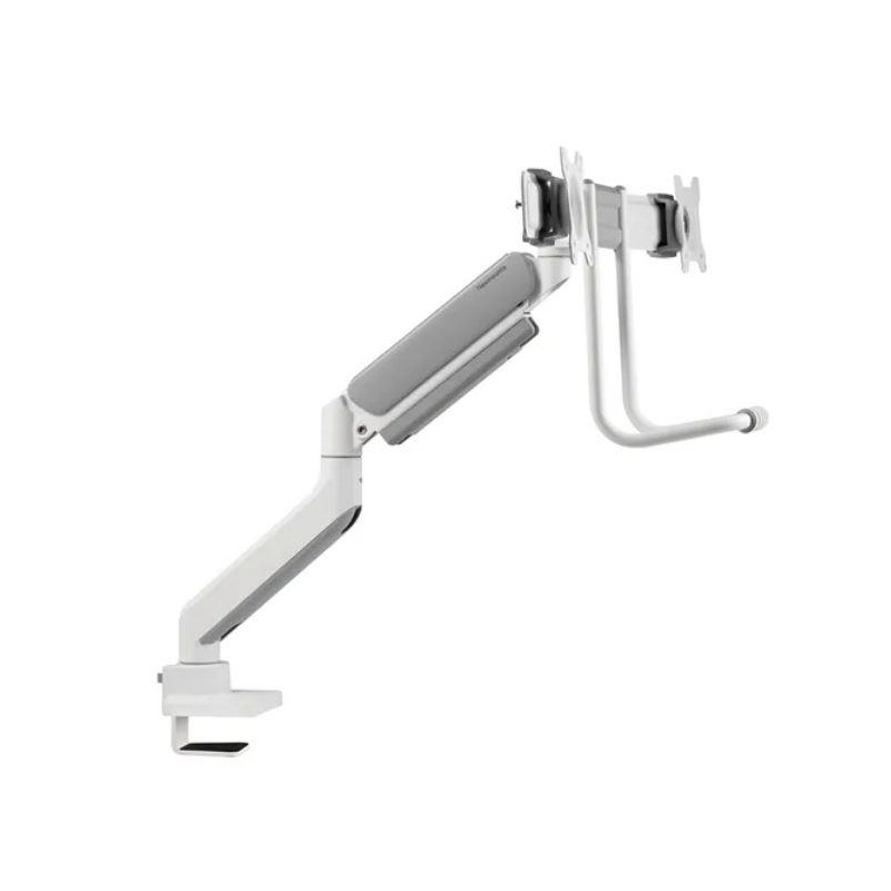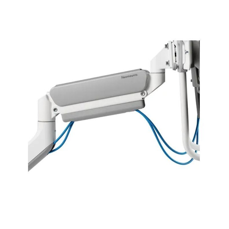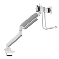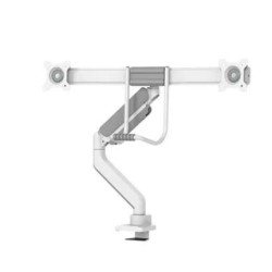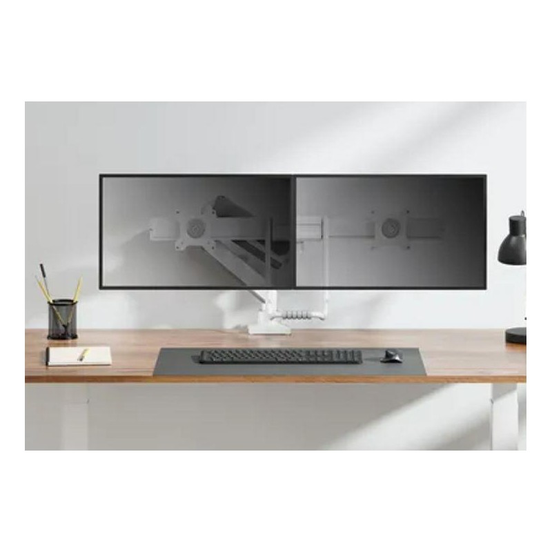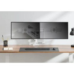 The Neomounts DS75-450WH2 NEXT Core is a full motion desk mount for two flat screens up to 32" with a maximum weight capacity of 8 kg per screen. The versatile tilt (20°), rotate (360°) and swivel (20°) technology allows the mount to change to any viewing angle to fully benefit from the capabilities of the screens. Additionally, the mount has gas spring height adjustment (27,7-56 cm) and depth adjustment (0-50,5 cm), to create the perfect working position. The DS75-450WH2 NEXT Core features the nifty 180° stop mechanism, that allows you to safely adjust the mount even when it's placed close to a wall or separation panel without making contact with the wall. The smart cable management system ensures orderly routing of the cables. The DS75-450WH2 is suitable for screens that meet VESA hole pattern 75x75 or 100x100 mm. Unused hole patterns can be covered using one of Neomounts VESA adapter plates. The desk mount is equipped with an Quick-release VESA system and comes with both a topfix clamp and grommet for quick and easy installation. The inner packaging of the NEXT Core is plastic free and made from cardboard and paper. For wall installation, the AWL75-450WH wall adapter is optionally available.
