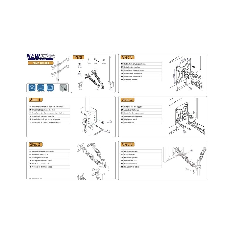 NewStar FPMA-D935D4 has three pivot points and is suitable for screens up to 26" (65 cm). The weight capacity of this product is 6 kg each screen. The desk mount is suitable for screens that meet VESA hole pattern 75x75 or 100x100mm. Different hole patterns can be covered using NewStar VESA adapter plates.