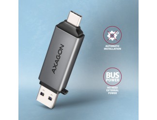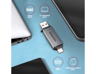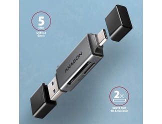 Mobile Mini Memory Card Reader AXAGON CRE-DAC with USB 5 Gbps interface supports all current versions of SD and microSD cards including SDXC and microSDXC with capacities up to 2TB.