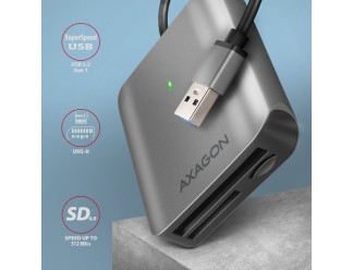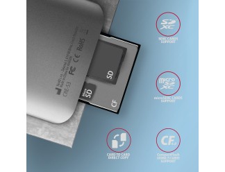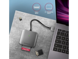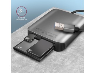 Aluminum 3in1 memory card reader AXAGON CRE-S3 SUPERSPEED with USB 3.2 Gen 1 interface supports all current versions of SD and microSD cards, including SDXC and microSDXC with capacities up to 2TB. It also supports CF cards with capacities up to 128PT.